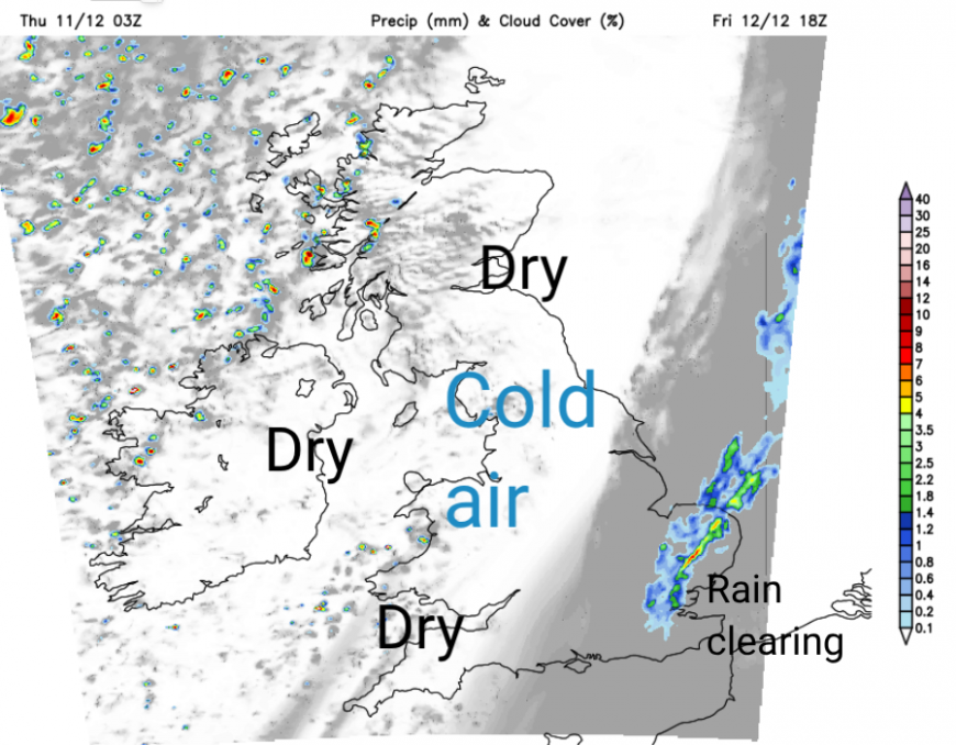 Friday will feel colder. This has been a very mild week even with the blustery winds. Colder air arrives from the west during Thursday night but it will take until Friday night to reach Kent and East Anglia. This brings a frost for southern Britain by Saturday morning but more breezy at the other end of the UK as a front approaches NW Scotland. Milder air will topple in for the weekend but things turn colder once more in the north during Sunday night.