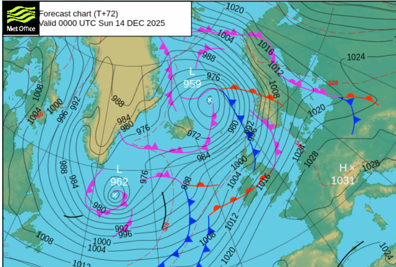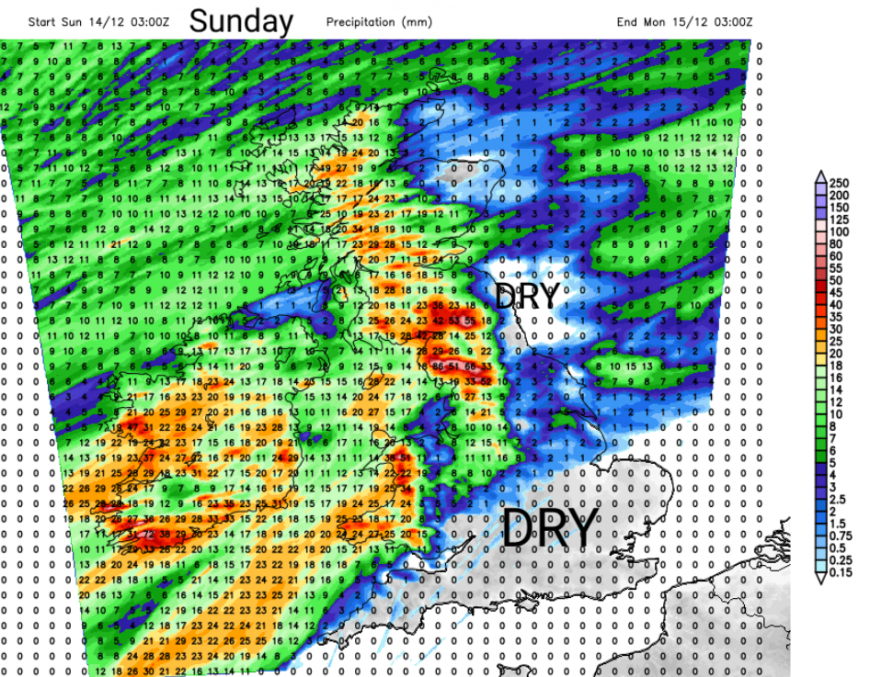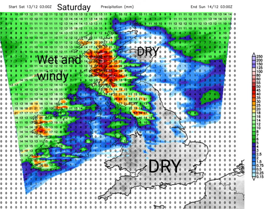 There is uncertainty as we head into Sunday about where the frontal rainbands will be reaching. Think of them as a rippling rope over the UK, with colder air to the north and a push of wet weather from the Atlantic reaching our western shores. It looks like western Scotland gets another bout of heavy rain early on Sunday and then the focus spreads over Ireland into southern Scotland, NW England, and Wales by the afternoon. Again with blustery winds blowing the Christmas decorations about and more of a breeze for southern Britain on Sunday.