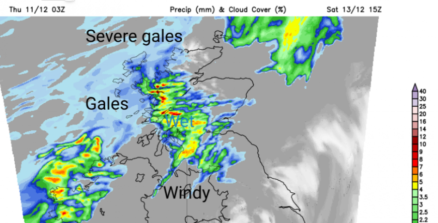 Saturday starts off fine and sunny but wet and windy weather from the incoming frontal system will edge into western Scotland with travel disruption possible due to southerly gales even severe gales. There will be quite a difference with calm, sunny weather for SE Britain and wild, windy weather for the west of the UK and increasingly across Scotland.