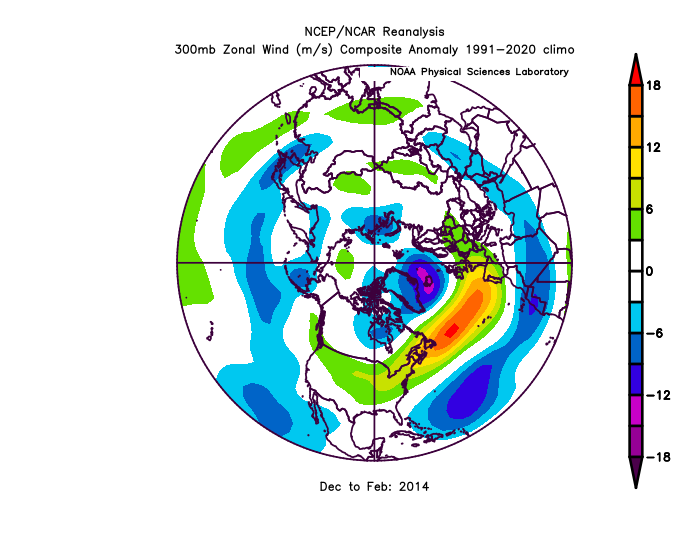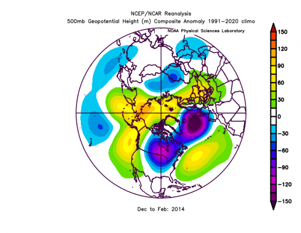 500 hPa anomalies Dec-Feb 2013-14, blues are low heights/pressure