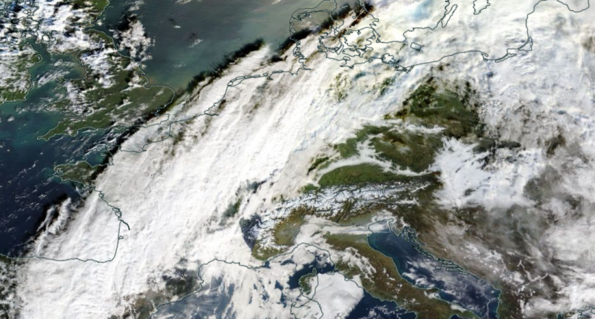 On the satellite image from 10th, you can see a wide swathe of frontal cloud over northern mainland Europe. There are also clear (sunny) areas where you can see the dendritic patterns of fog filling low valleys where cold air stagnates. Also, the snow cover over the tops of the Alps. There hasn’t been much snow recently, just the odd cm in the Three Valleys region of France and for a few Italian resorts.