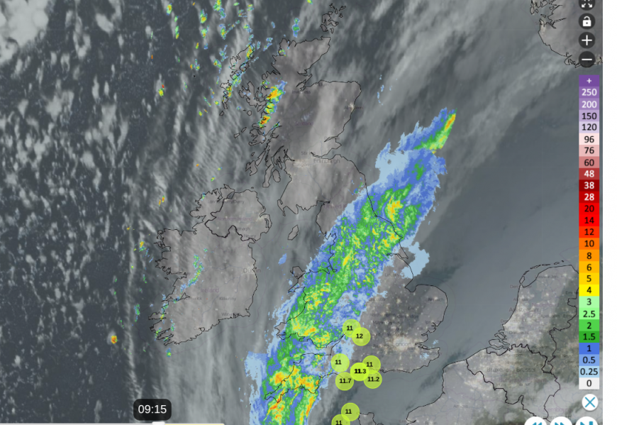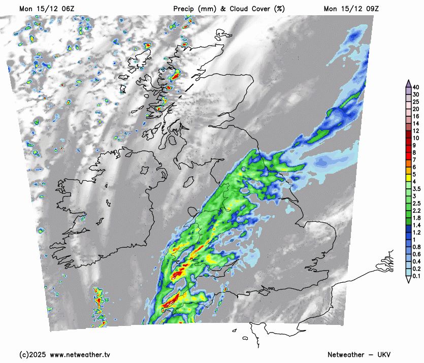 This conveyor of rain will continue today, focused on southern Wales, where the air lifts and cools over the hills, depositing more rain. The amber warning runs into Monday evening for south Wales. Heavier rain on the UKV Model heads for the Bristol Channel region through this afternoon and across the West Country. The rainband will become more patchy later on Monday and will move away from Wales. There will be overnight rain for central southern England, the Midlands up to North Yorkshire.