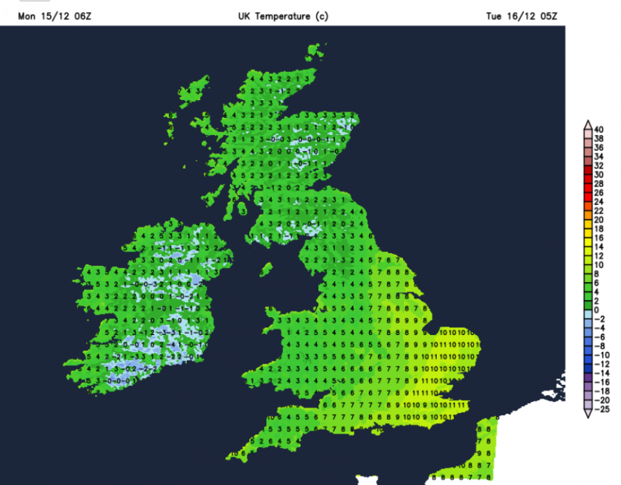This leaves a cold and frosty Monday night in the north and west, but still mild to the southeast of the frontal divide. Quite a stark temperature difference across Britain by Tuesday morning. There could be some early fog for northwest Britain after all the wet weather and as temperatures fall to around freezing. Although there will be the dregs of the front over London and the Home Counties, into East Anglia on Tuesday, much of the UK will see a fine Tuesday, with sunshine but colder air. And a cold first part of the night later on Tuesday with fog forming in southern Britain as temperatures fall.