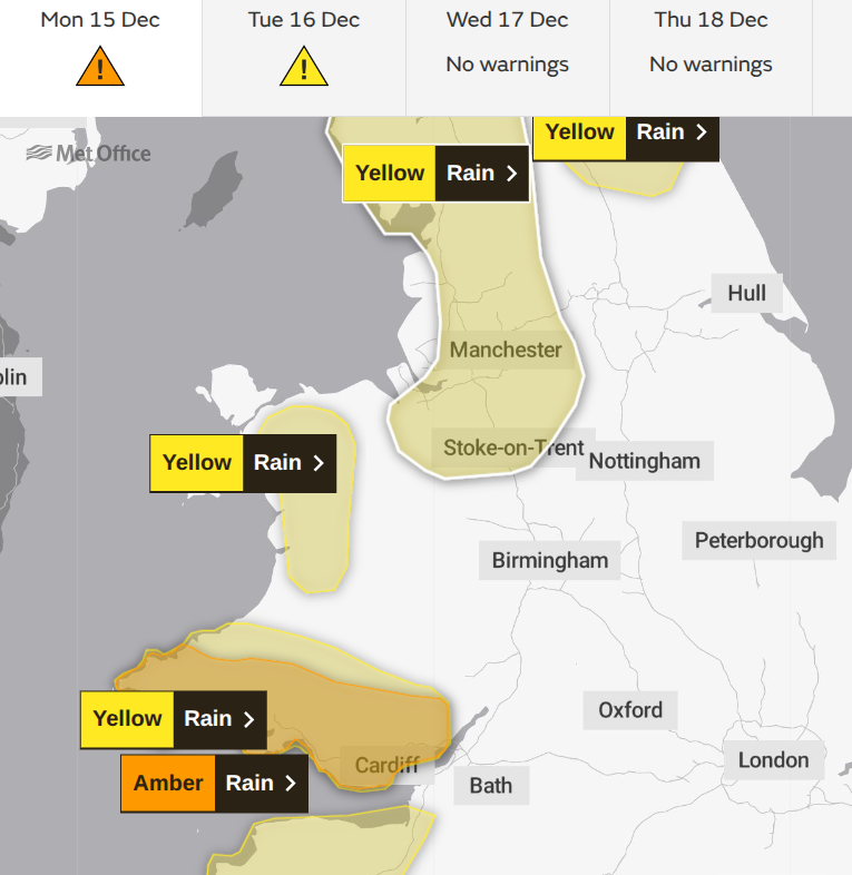 “Ongoing local river flooding is expected for parts of the North of England until Wednesday and the River Severn from today until Thursday. Further heavy and persistent rainfall on Thursday means that local inland flooding will be possible for the North West and South West of England.”