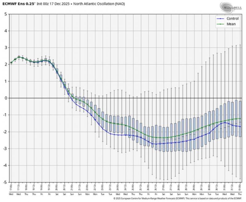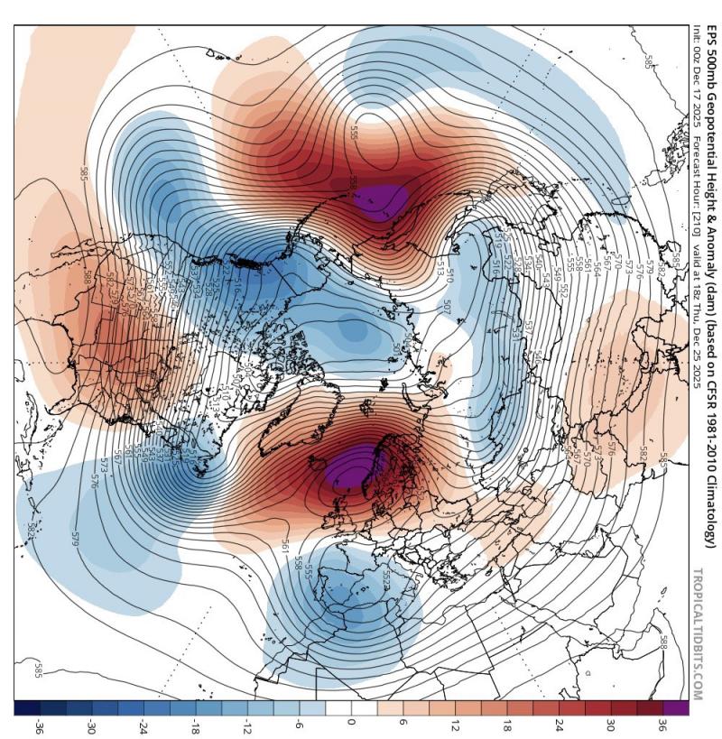 The 00z EPS ensemble mean showed a strong block to north of the UK with anomalously high mean 500 hPa heights over the Norwegian Sea for Christmas, North Atlantic Oscillation (NAO) going pretty negative as a result next week, which indicates higher pressure than normal over Iceland and low pressure over Portugal.