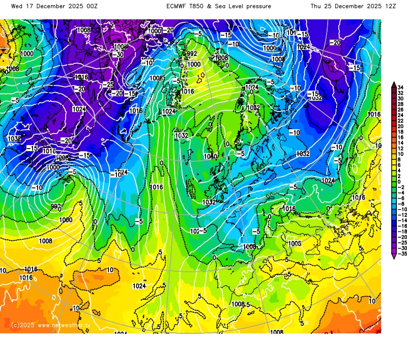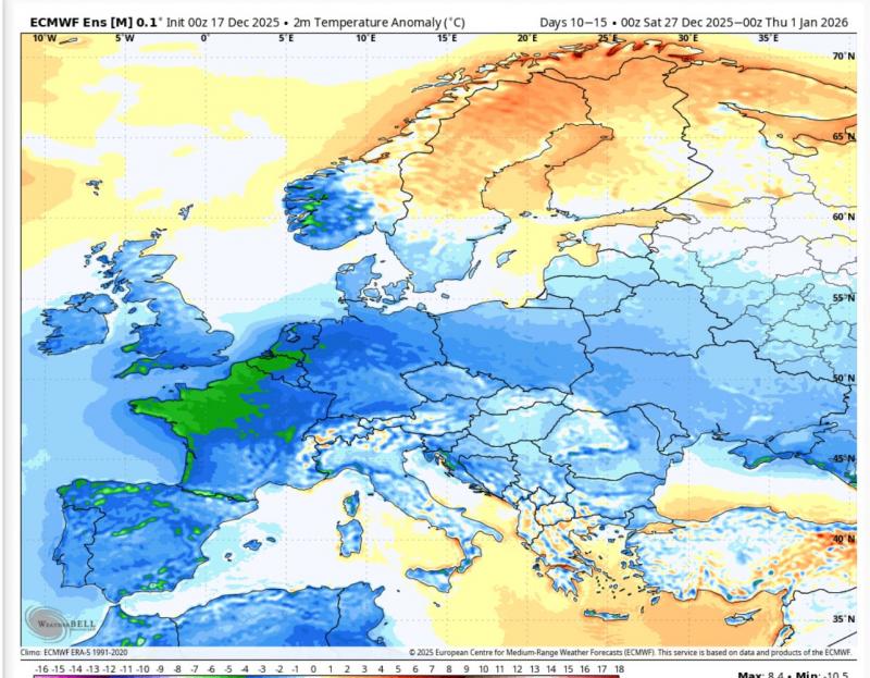 So, we should look east for our weather for the festive period, potential to tap into air cold enough for snow even on the big day, while the ensembles suggest, for now, the cold conditions will persist through to the New Year, as the EPS mean 2 metre temperature chart for days 10-15 below suggests: