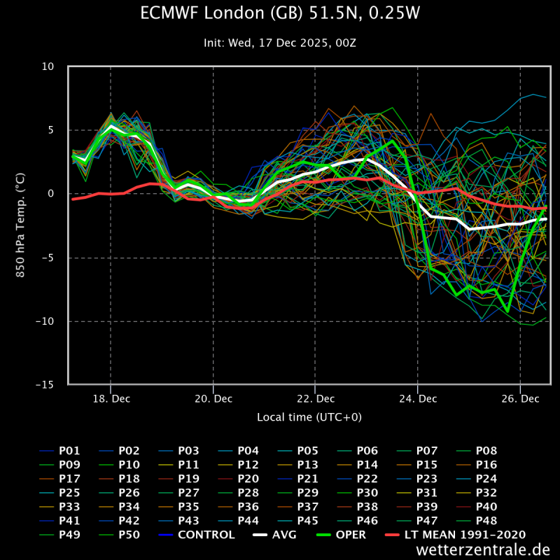 A look at the 00z EPS for London indicates the high res run was at the cold end of the spread for Xmas, but not without support. A large spread in the ECMWF ensembles though by Christmas, which brings the uncertainty over how cold the easterly will be.