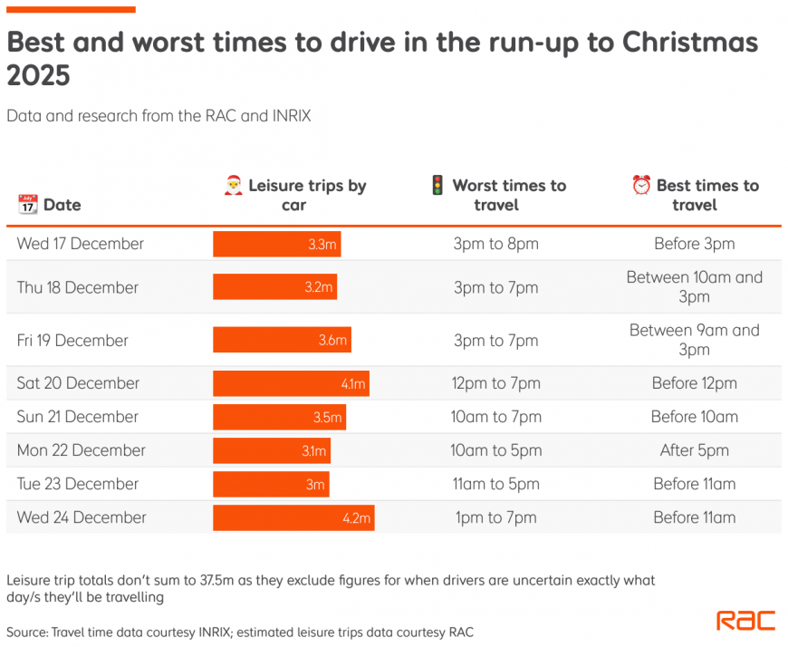 This weekend sees the start of the festive getaway. Although many people may be facing three or more days of work before Christmas, many schools will have finished for 2025 and people will be keen to get going. Christmas isn’t until Thursday next week but Saturday 20th and Christmas Eve stand out as the busiest days according to the RAC’s predictions