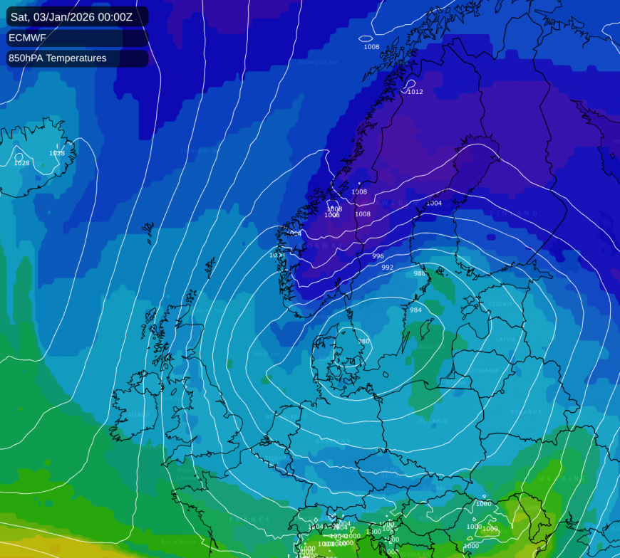 The outlook into the New Year has high pressure retrogressing to the north-west of Britain, allowing northerly blasts to head into Europe. It is currently uncertain whether these will directly hit the British Isles, or go out to the east, into the North Sea and central Europe, with Britain just getting scraps on the western flank. Most recent model runs have shown the second scenario, but this morning's ECMWF run (as of 27 December 2025) had quite a potent northerly hitting Britain on 2-3 January and further northerlies after that. A generally cold dry outlook is looking probable, but how cold it will be, and whether it will be cold enough to give snow for some, is uncertain.
