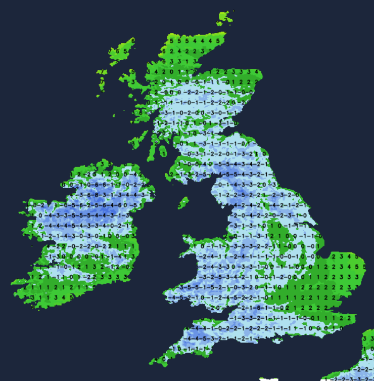 You'll avoid a frost where you keep cloud, say 3 to 5°C, but under clear skies temperatures will fall close to or just below freezing. By morning, some sheltered Highland glens, rural parts of western Scotland and perhaps Northern Ireland may see patchy freezing fog returning, where locally the thermometer could fall as low as -5 or -6°C in the coldest spots.