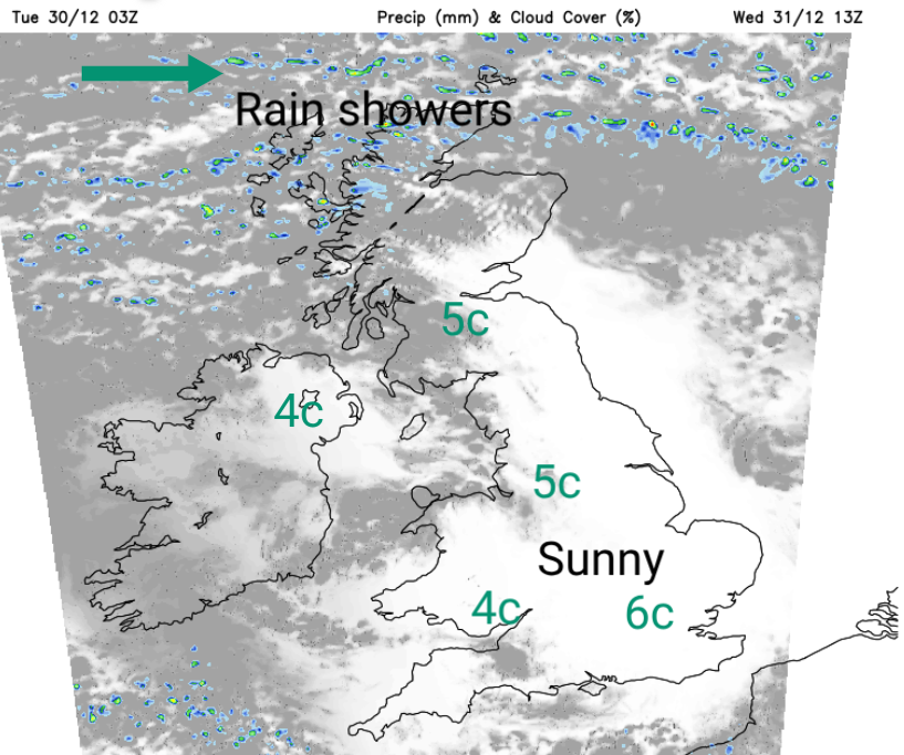 There will be snow showers for the first few days of the new year, focused on the northern half of Scotland but reaching Northern Ireland and Wales in the NNW flow. As this flow veers to a northerly, some of the wintry showers will reach down North Sea coasts with a few bands of mixed showers working their way right down through Britain.