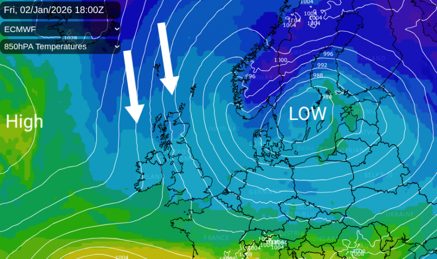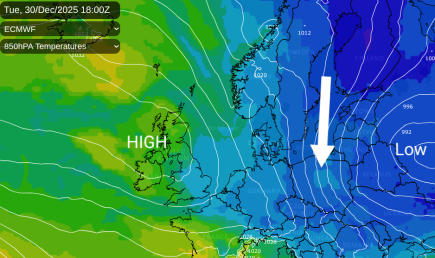 Looking at the temperature charts for the 30th, the cold air (indicated by deeper blues) has been steered southwards to Germany by a low-pressure system over western Russia anchored by our steady high pressure extending over the North Atlantic. Northern Poland has seen heavy snow and ice, with red and amber weather warnings on Tuesday in the cold northerly flow. Eastern Europe will be in the grip of perishing cold for the end of 2025.