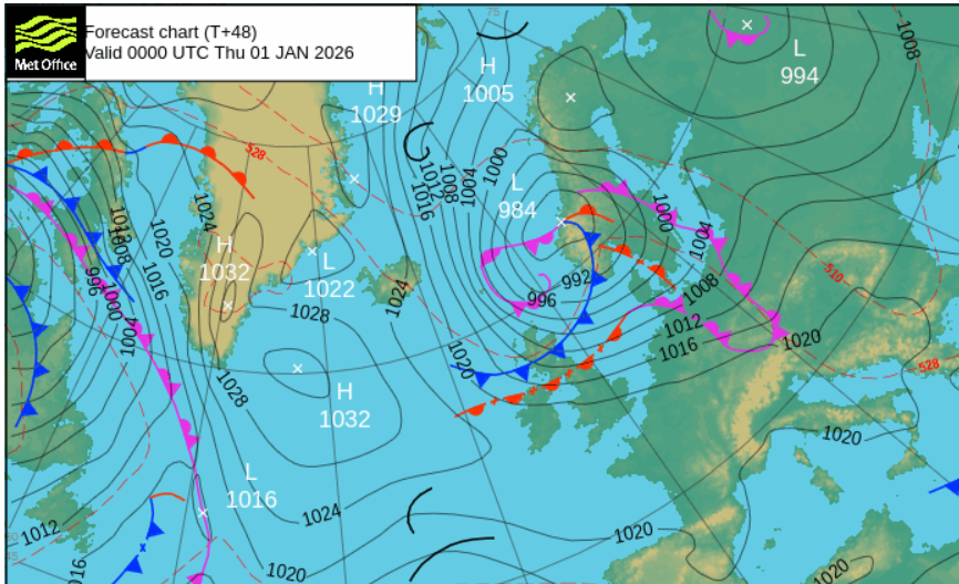 For Hogmanay, Edinburgh +4C feels like 0C in the wind with a chance of a sleety rain shower, Glasgow looks wet 6C but feels like 2C with the wind and rain, Aberdeen 4C feels like 0C in the wind with icy rain or sleet showers. Northwesterly gales for Orkney at the Bells.
