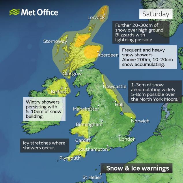 Northern Scotland will see the most severe conditions, with Amber Snow Warnings in force here until midday on Saturday, for up to 40cm of snow, then yellow warning takes over for the rest of the weekend into Monday. While yellow warnings for snow and ice are in force for N. Ireland, Wales, parts of the Midlands, SW England and North Sea coasts of eastern England over the weekend and into Monday.