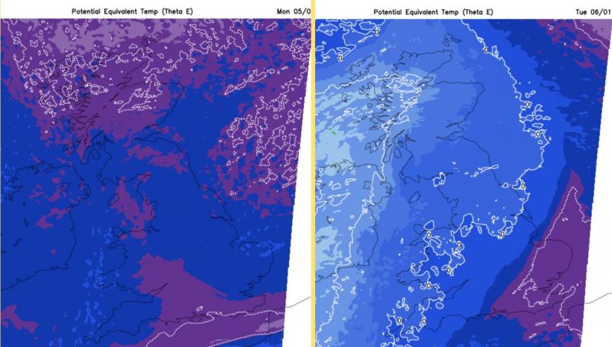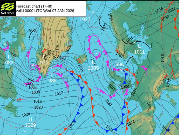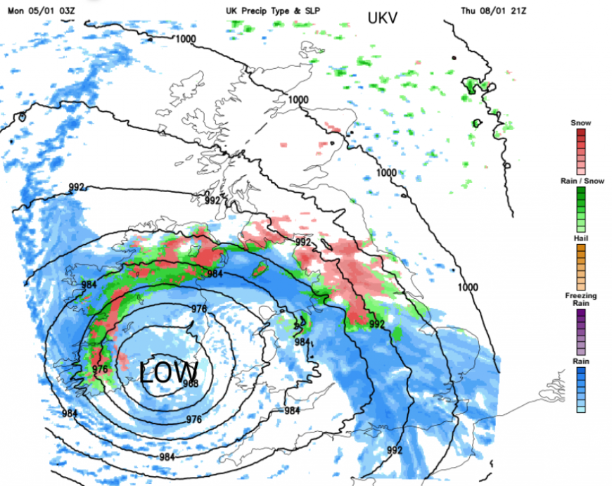 It will be cold overnight Wednesday into Thursday, especially for eastern Britain. Eyes are turning to a low pressure signal later on Thursday. The UKV model has a significant low pressure for Thursday night, bringing severe gales into the Western Approaches with heavy frontal rain from the southwest. This turns to snow as it reaches northern Britain and Northern Ireland drawing in a strong easterly wind. This leaves a wet, wintry and wild Friday as the low centre moves over Britain, although it could be quieter near the centre of the low pressure.