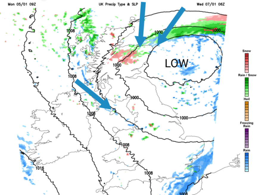 The bitter Arctic cold holds clings on this week with a few attempts at dilution. Atlantic low pressures are going to complicate the existing snow shower pattern which has clobbered northern Scotland so far this year. There is a mess of two low centres swinging over the UK later on Tuesday, and a particularly tricky, even stormy low from the southwest for Thursday night. All this precipitation will encounter the cold Arctic air, resulting in a mix of icy rain, sleet and snow.