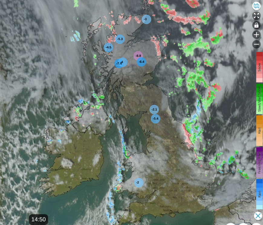 Netweather Radar showing snow shower pattern in a north wind. Lowest air temperatures and satellite cloud cover