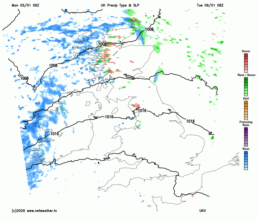 The northerly flow, which has driven snow into NE and eastern England, is easing and backing later on Monday so it will become dry and potentially icy here. A few more wintry showers will trouble north Wales and along western fringes but the main focus changes to the far northwest overnight. One low centre will move from Ireland down to Wales as the deepening low skims past northern Scotland to the North Sea.