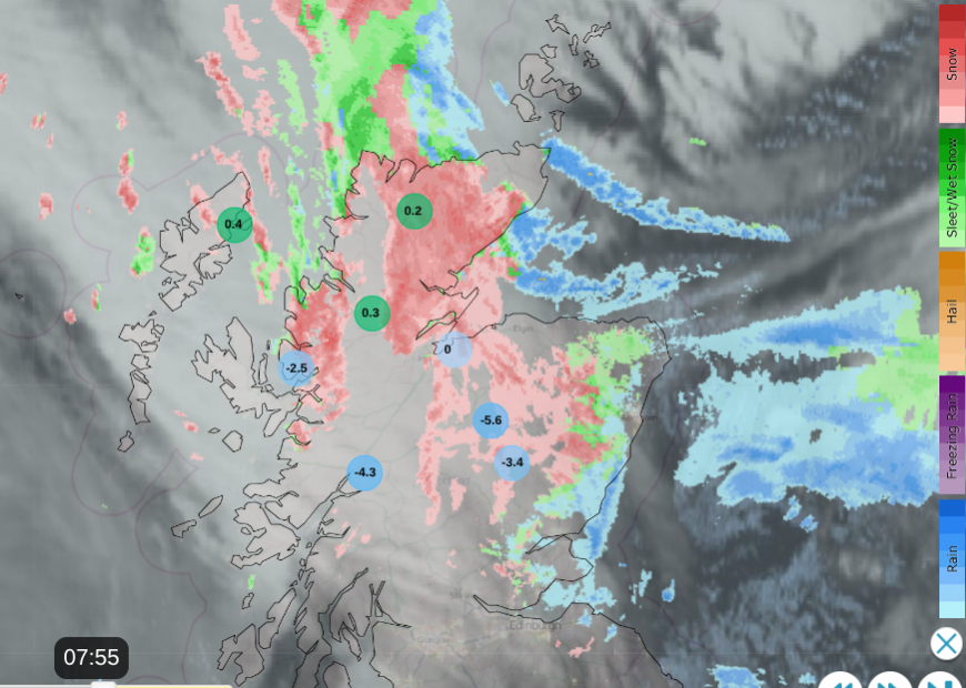 A Snow & Ice yellow warning remains across northern Scotland on Wednesday as a low pressure edges further away over the North Sea. The trailing occluded fronts will bring further snow to NE Scotland, Caithness and Orkney this afternoon with more falling snow for the evening rush hour around Aberdeen.