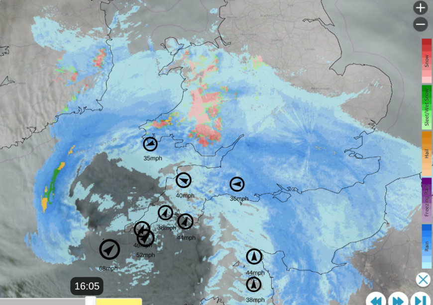 Goretti’s frontal rain is already over southern Britain but as the low centre nears the rain (and snow over the Moors) will ease as the winds increase. For the Amber warning, Cornwall starts with SE winds, as the cyclonic pattern will veer around to the NW this evening.