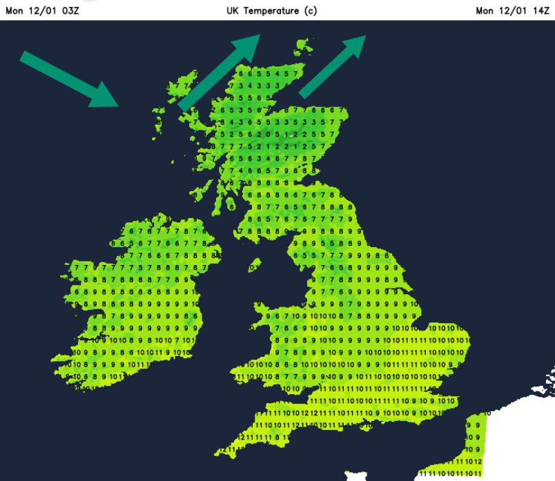 The far north of Scotland has been wet and windy overnight with Sunday’s low pressure heading past Shetland today. Following this is a brief milder airflow over the UK with southwesterly winds. It feels very different out there for Monday morning with temperatures round 7 to 10C by 9am.