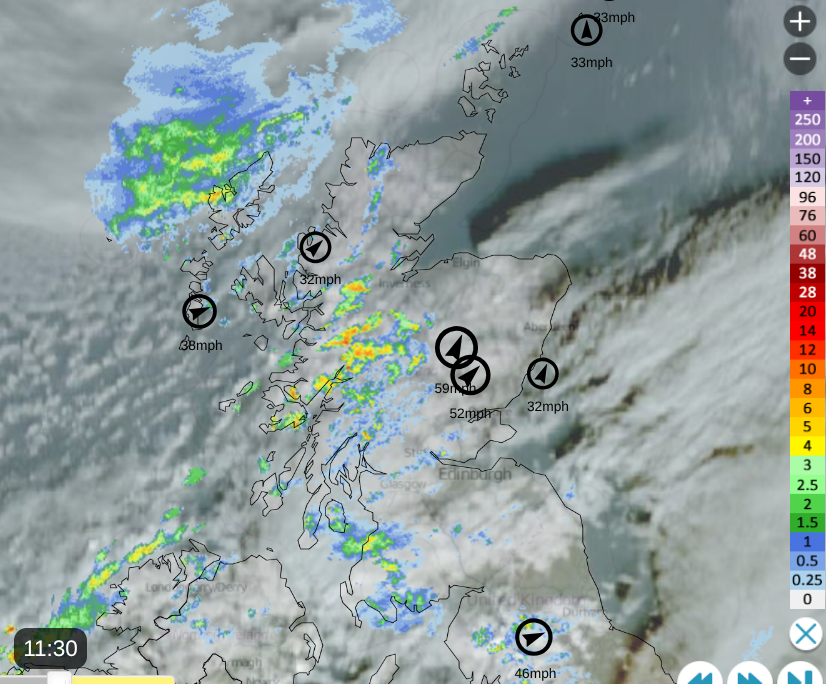 Netweather Radar showing rain showers and cloud cover with top ten windspeeds at 11:30 Monday 12th