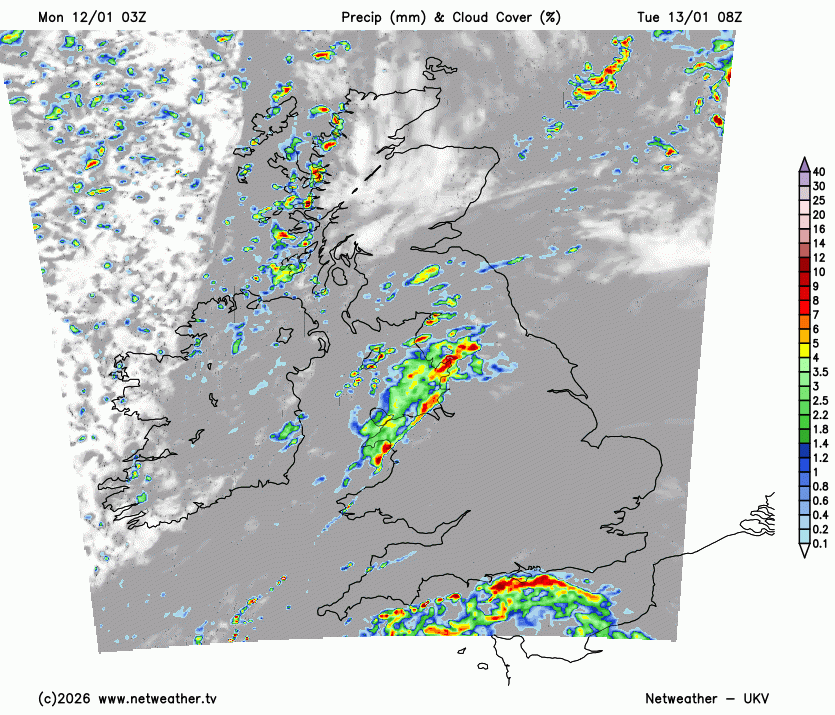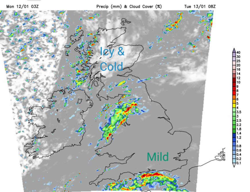 Clusters of showers will move by with lines developing through the night. There is an ice warning for Monday night over northern and northeastern Scotland as temperatures fall and the melting snow freezes.