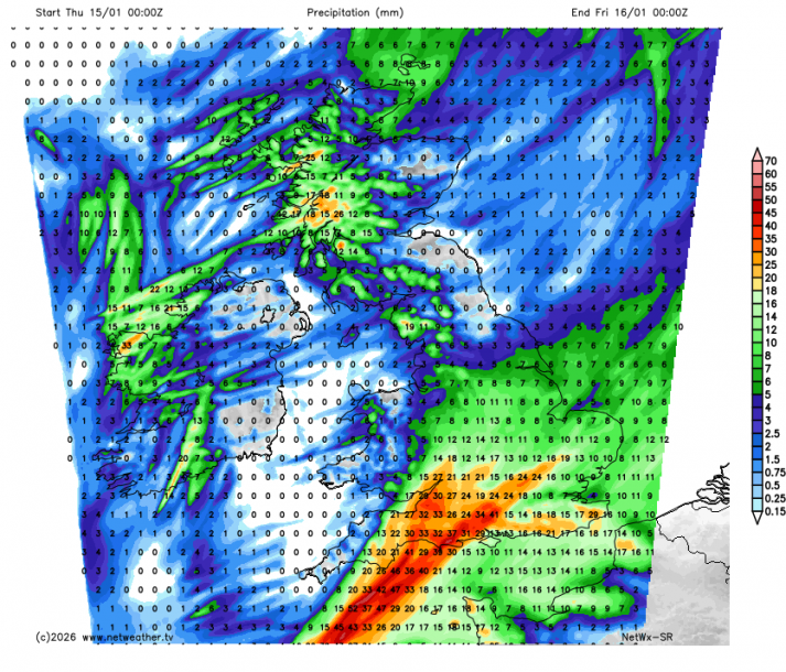 This low pressure system was forecast to deepen much more on previous model runs, particularly ECMWF, but it’s looking less developmental now with a shallower more strung out low, so rain rather than wind will be the issue. We’re not talking large rainfall totals by the end of tomorrow, widely 20-30mm possible across southern and eastern England, perhaps locally 40-50mm towards the south coast. But falling on saturated ground following recent rain, it may cause some localised flooding issues.