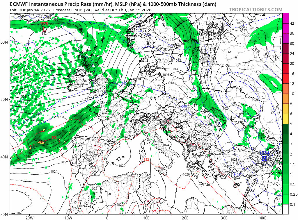 Then Thursday is looking rather wet for southern England, Midlands and much of eastern England, as frontal wave developing north of the Azores this morning runs northeast and forms a low off NW Spain early tomorrow. The low then becomes elongated as it moves northeast over the Bay of Biscay and is forecast to develop two centres strung SW-NE, as a shortwave trough moving in from the west becomes increasingly amplified as it engages the low and cyclonic vorticity along the forward side of the trough becomes more strung out.