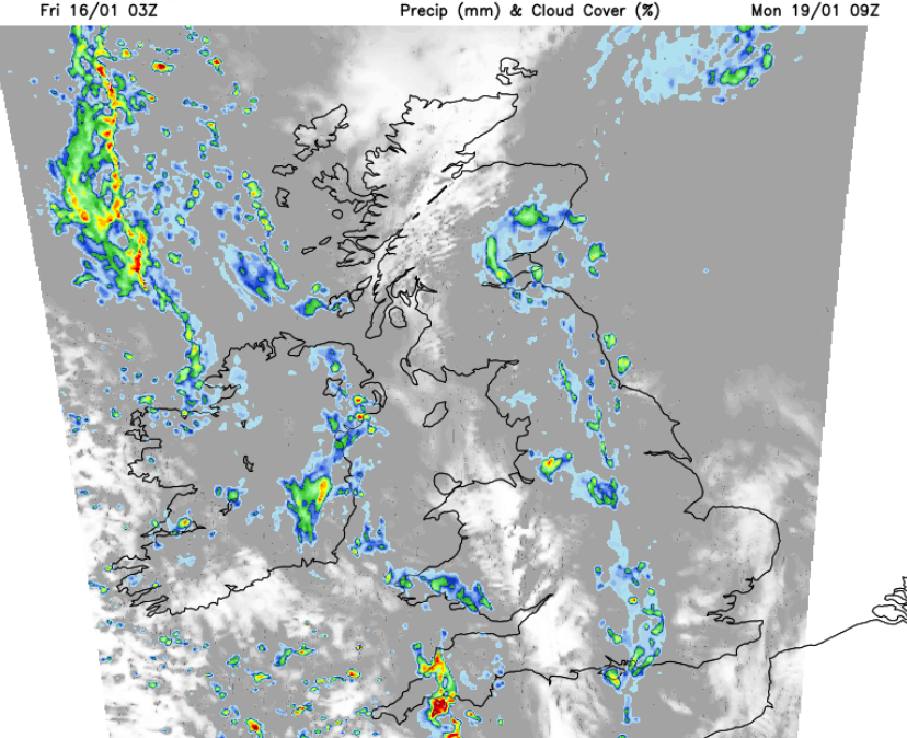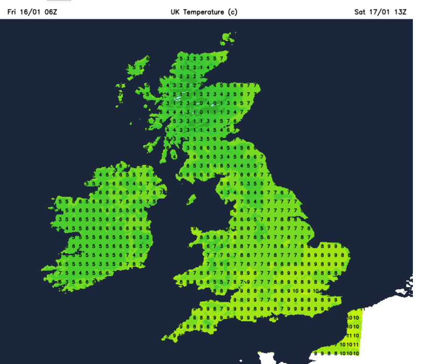 As Manchester United play Manchester City at lunchtime on Saturday it should be dry as the lines of showers stay along the spine of northern England. Temperatures will be around 8 or 9C which won’t be too bad (for January) with only light winds. London should reach 10C as northern Scotland stays around 5C.