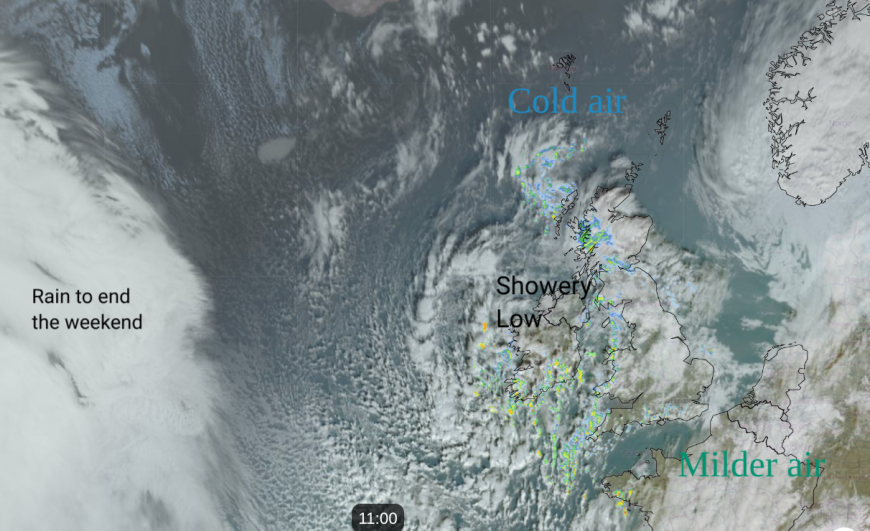 We have flimsy low pressure over the UK with bands of showers which interrupt the overall benign pattern. The unstable and moist Polar Maritime airmass and the low, continue to generate showers which rotate around it. Some of these showers could produce a sharp downpour, even hail today with dramatic anvil clouds against the winter’s sky. More well scattered showers will reach in from the southwest later this afternoon, heading towards Belfast and the Inner Hebrides.