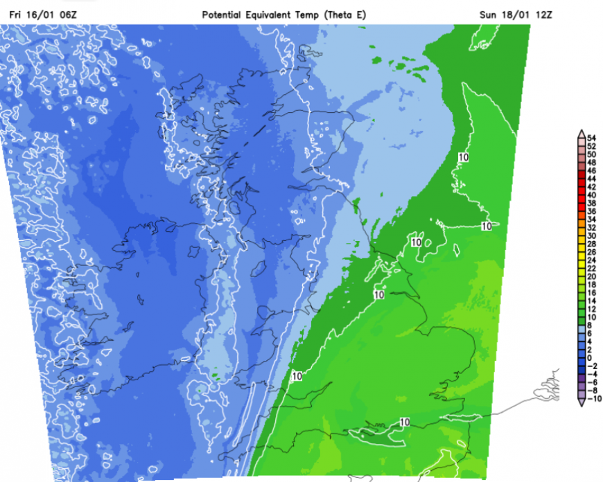 Where the fog lingers it will feel cold. Western Wales, SW England, NW Scotland could all see sunshine away from the incoming occlusion off the Atlantic but also out of reach of the warm front from France. In the milder air behind the warm front temperatures could reach 9 to 11C.