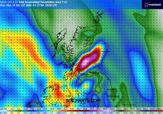 This means frontal systems moving in from the Atlantic could be rather slow to move on, so some areas could see quite a bit of rain this week. Higher ground of eastern Scotland is looking particularly prone to some large rainfall totals from mid-week, thanks to a persistent moist southeasterly flow, with slow-moving frontal zone and the mountains creating lift of the prolonged feed of moist air. The Met Office has a yellow warning for rain in force between noon Wednesday and noon Friday for Grampian, Central, Tayside and Fife for as much as 80-120mm over higher ground.