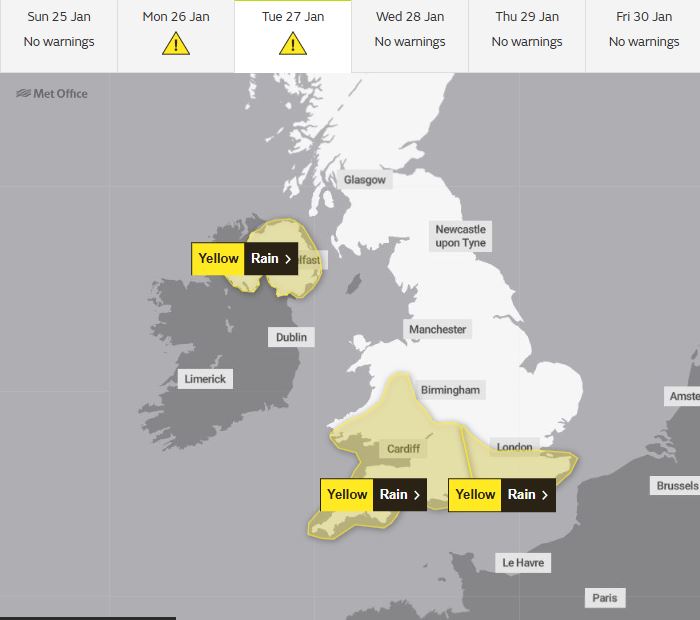 UK Met Office yellow rain warnings in force for N. Ireland, Wales and S England for early next week