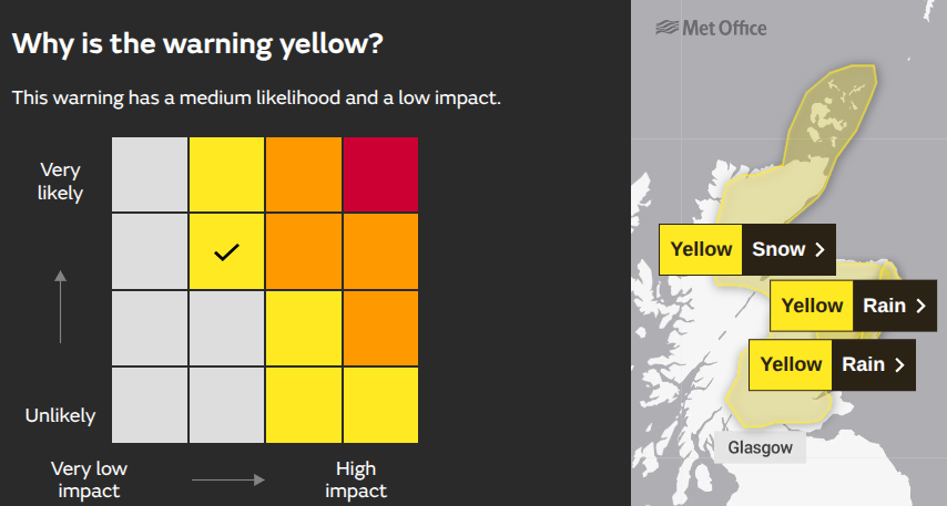 These Weds/Thurs snow and rain warnings have "a medium likelihood and a low impact", so are quite likely to happen but high impacts are not expected.