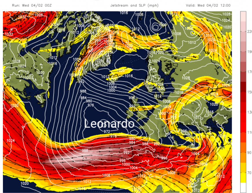 There will also be a succession of fronts moving north over the UK in the flow around Leonardo. More damp weather and cloud for southern Britain on Thursday morning, on one of these bands. London looks wet on Thursday with temperatures around 9C, but feeling more like 6C.