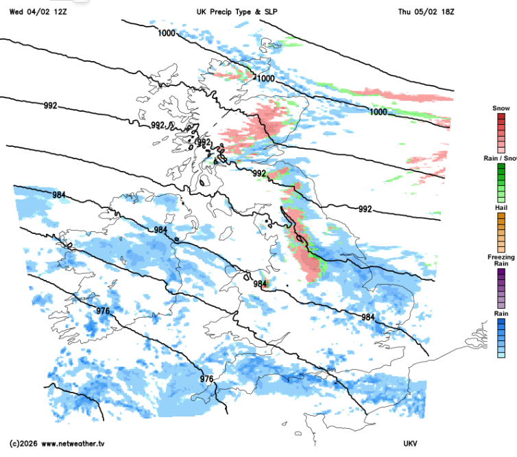 Heavier rain will appear by Thursday evening for southern Britain as the wet weather over northern hills turns increasingly wintry. Snow over the Pennines, Southern Uplands and inland eastern Scotland. It looks wet for Northern Ireland and Wales by Friday morning, with the easterly flood bringing more wet and wintry weather to NE Britain. Northwestern Britain will do quite well for shelter and drier conditions on Thursday and Friday.