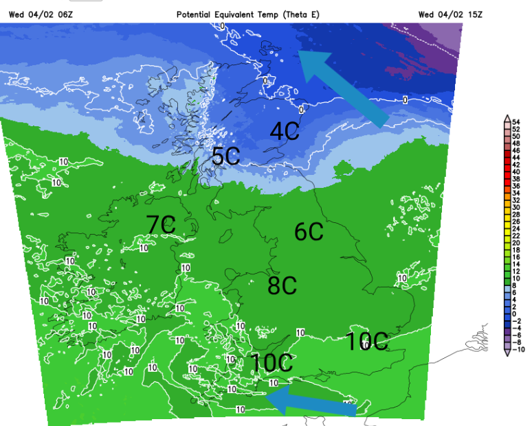Northern Britain will continue to see wet and wintry weather on Wednesday. Exposed counties of Northern Ireland will also see a grey and damp midweek. Behind the warm front, the cloud will lift and with brighter skies, it won’t feel as cold. There will be a scattering of showers for SW England this afternoon and heavier ones tonight as a small low centre comes close.