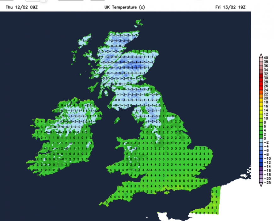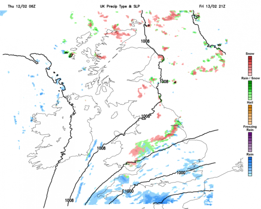 During Friday, the Arctic airmass will feed over more of the UK. The low pressure over SW Britain will pull southwards over France. Finally there will be brief respite for the saturated ground of Wales and southern England where river and groundwater levels remain high. As the frontal rain clears away, there will be sleet and hill snow on the back edge of the frontal bands.