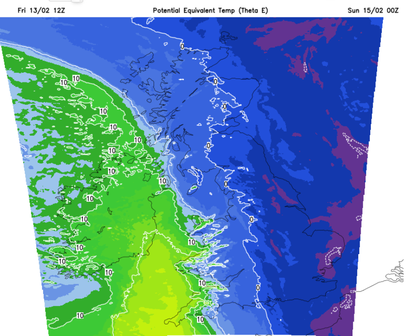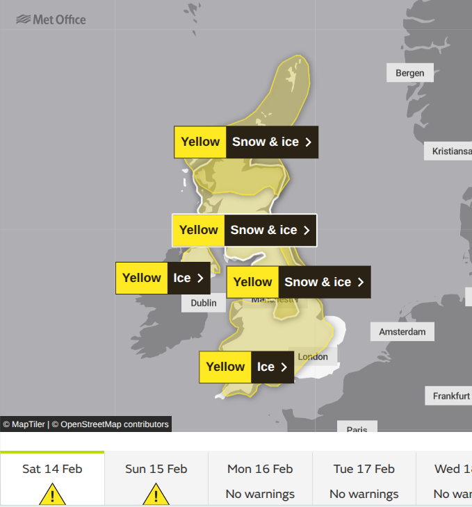 Cold air is taking hold for the end of the working week. There is the promise of sunshine for Saturday, Valentine’s Day. There are warnings for ice, and it will be a frosty start to the weekend for much of the UK. Then all change from the west during Saturday night as an Atlantic front interrupts the cold Arctic air. This will bring a spell of wet and wintry weather, which will clear away over the North Sea on Sunday morning.