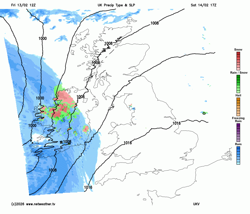 There will be a few wintry showers for the north coast of Wales, perhaps managing to clip Norfolk and a more hearty band reaching the Northern Isles on Saturday afternoon. Gradually, high cloud will appear from the west, extending and lowering over Ireland into western Britain. This is the frontal system from the Atlantic.