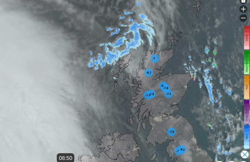 We have cold air in place over the UK and Saturday night will see a band of rain, sleet and snow sweep eastwards. There is a yellow Snow & Ice warning over all of mainland northern Britain
