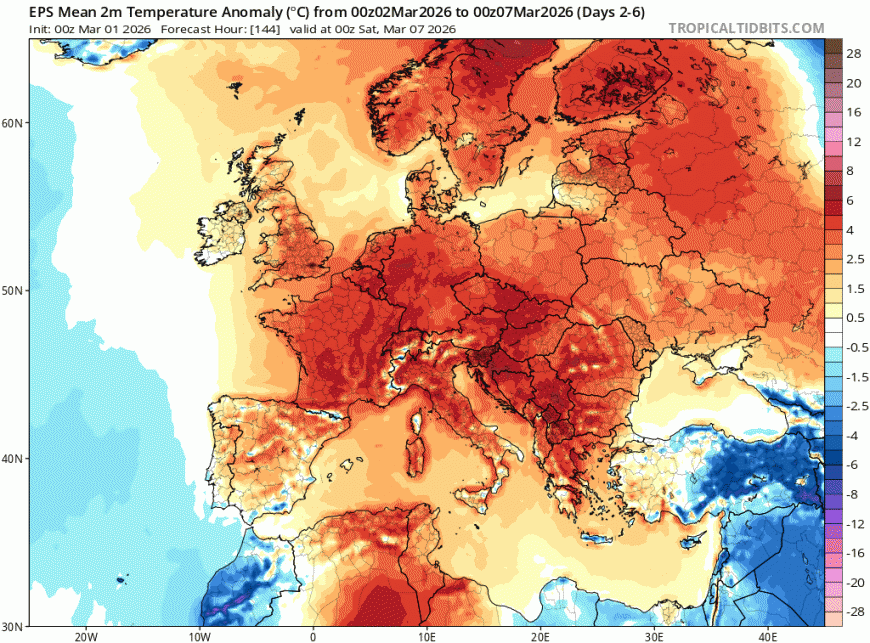 Rather mild this coming week, as the 2 metre temperature anomaly chart for Mon-Fri below shows
