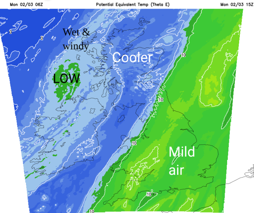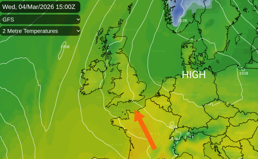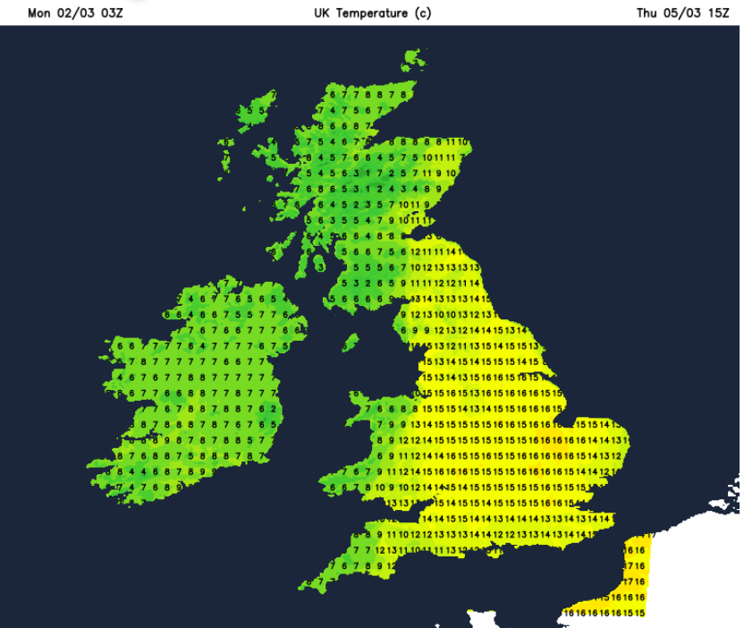 By Wednesday, there will be some cloud in this mild flow with patchy rain over Northern Ireland and western Scotland. By the afternoon, much of the UK will feel mild. Quite a difference for those areas that have been north of the frontal boundary and in the cooler air. Southern England inland could again see 13 to 15C, but in any sunshine the temperatures could rise to 16 or 17C.