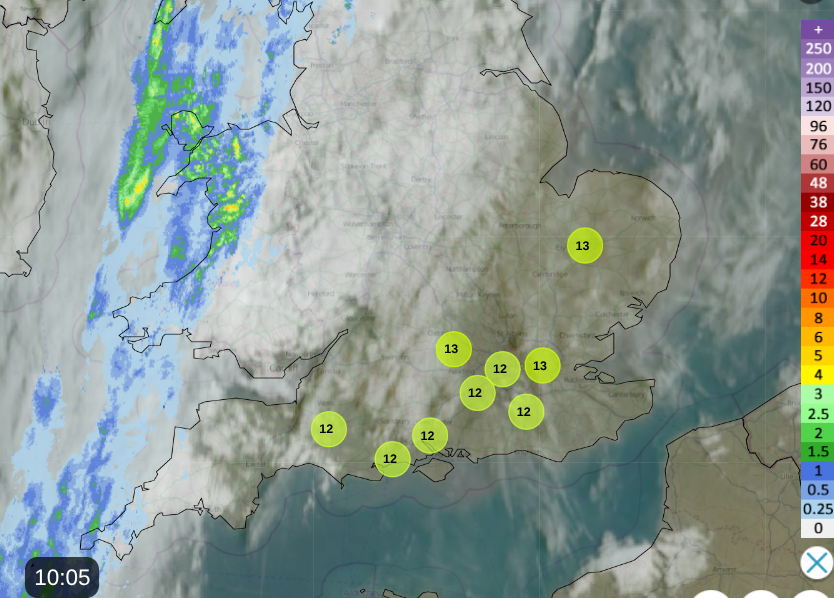 Clear skies and sunshine for SE Britain mid-morning on Monday with top temperatures of 12 or 13C at 10am