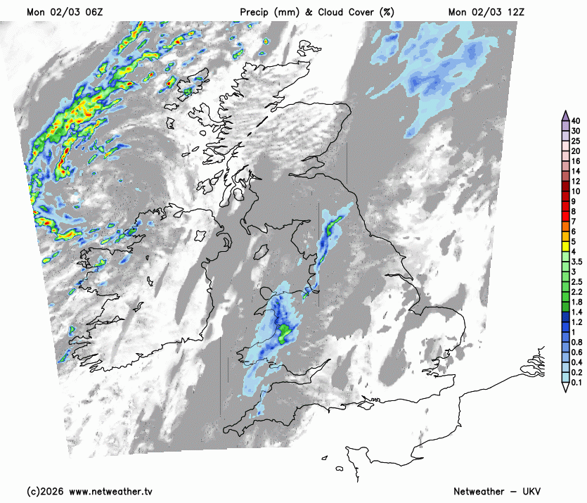 There is a cold front stretching across the UK on Monday morning. It extends from Shetland, along eastern Scotland, to Cumbria and Anglesey, to the Isles of Scilly, with patchy rain and blustery winds.