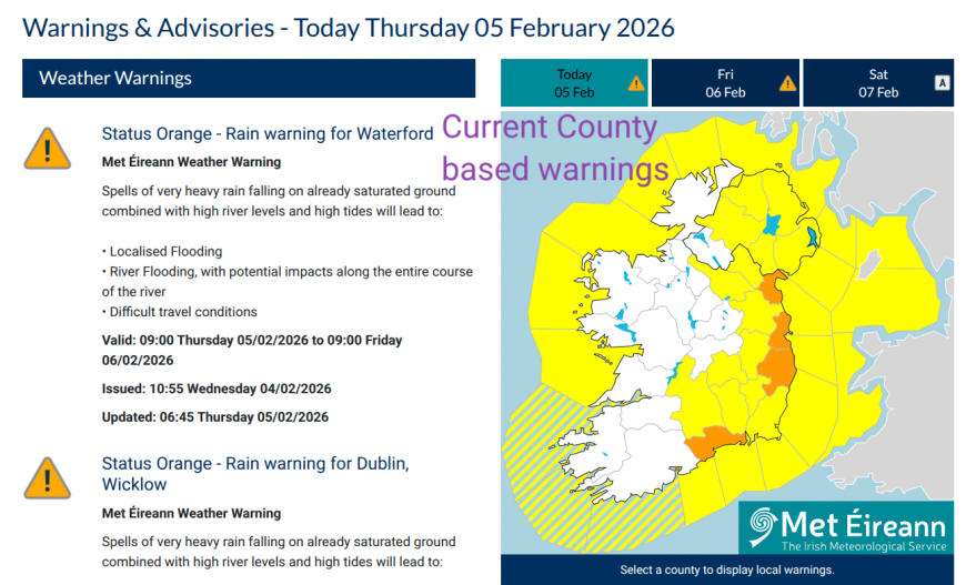 Met Eireann should have a new weather warning system by the end of 2026. A move away from county-defined warnings to different shaped areas, which fit the weather better.