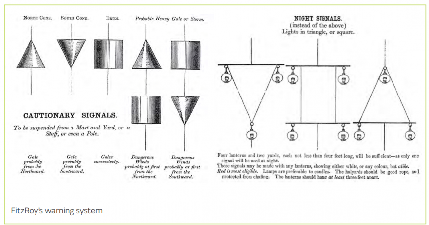 Fitzroy viewed the barometer as a significant aid to forecasting and placed barometers in a number of fishing villages along the coast. FitzRoy’s barometers saved countless lives but perhaps his biggest single impact on safety at sea with his plans for a Storm Warning Service.