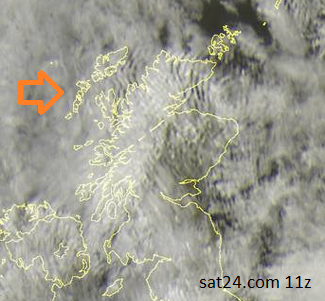 Looking at the visible satellite picture today, particularly over northern Scotland you can see lines on the white clouds. These are mostly running N/S with northern Britain sitting in a fresh westerly wind (orange arrow). It is westerly at the surface and up through the atmosphere