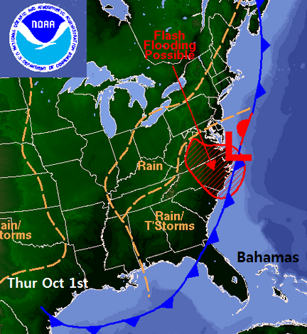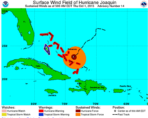 For the eastern states any possibility of extra significant rainfall, is a big problem. Already many states have flood warnings in place; parts of Maine and N.Carolina have seen flooded states already this week. A system already over the Mideast is bringing heavy rain with more forecast into the weekend, even without Joaquin’s contribution. The presence of Joaquin away to the South is stalling the system bringing the heavy rain to theses states but any additional tropical downpours could result in widespread flooding.